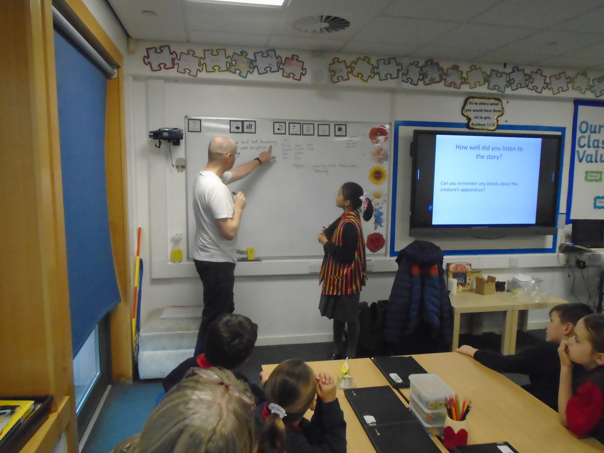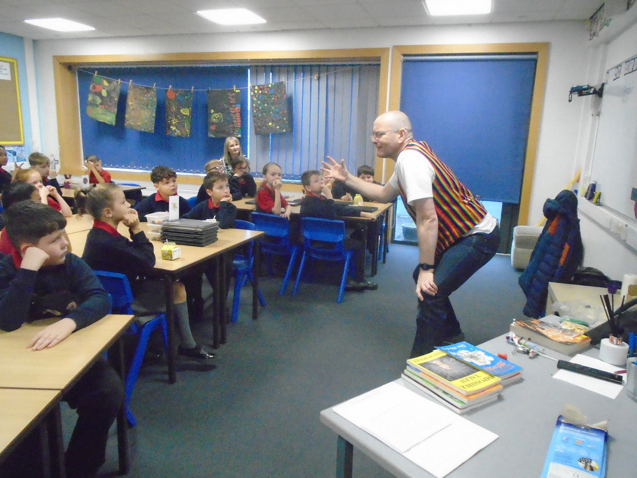 Dan worked with the children to create their own ‘Poolie’ creature for them to use in their version of his story. Some of them even got to wear his special story telling jacket! We were lucky enough to receive some copies of his books and a sneak peek into his new novel Creepy Impossible Tales!