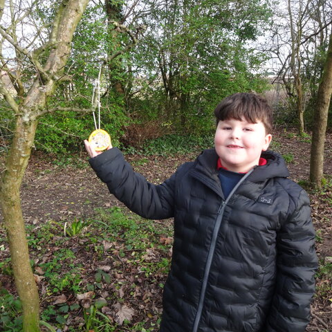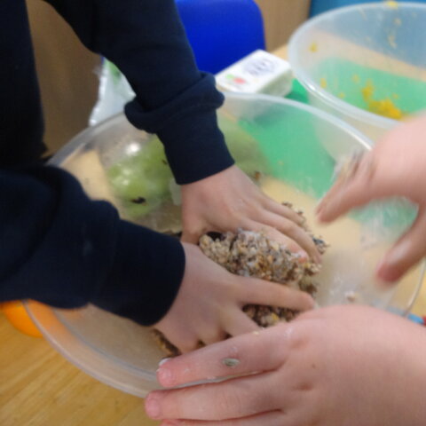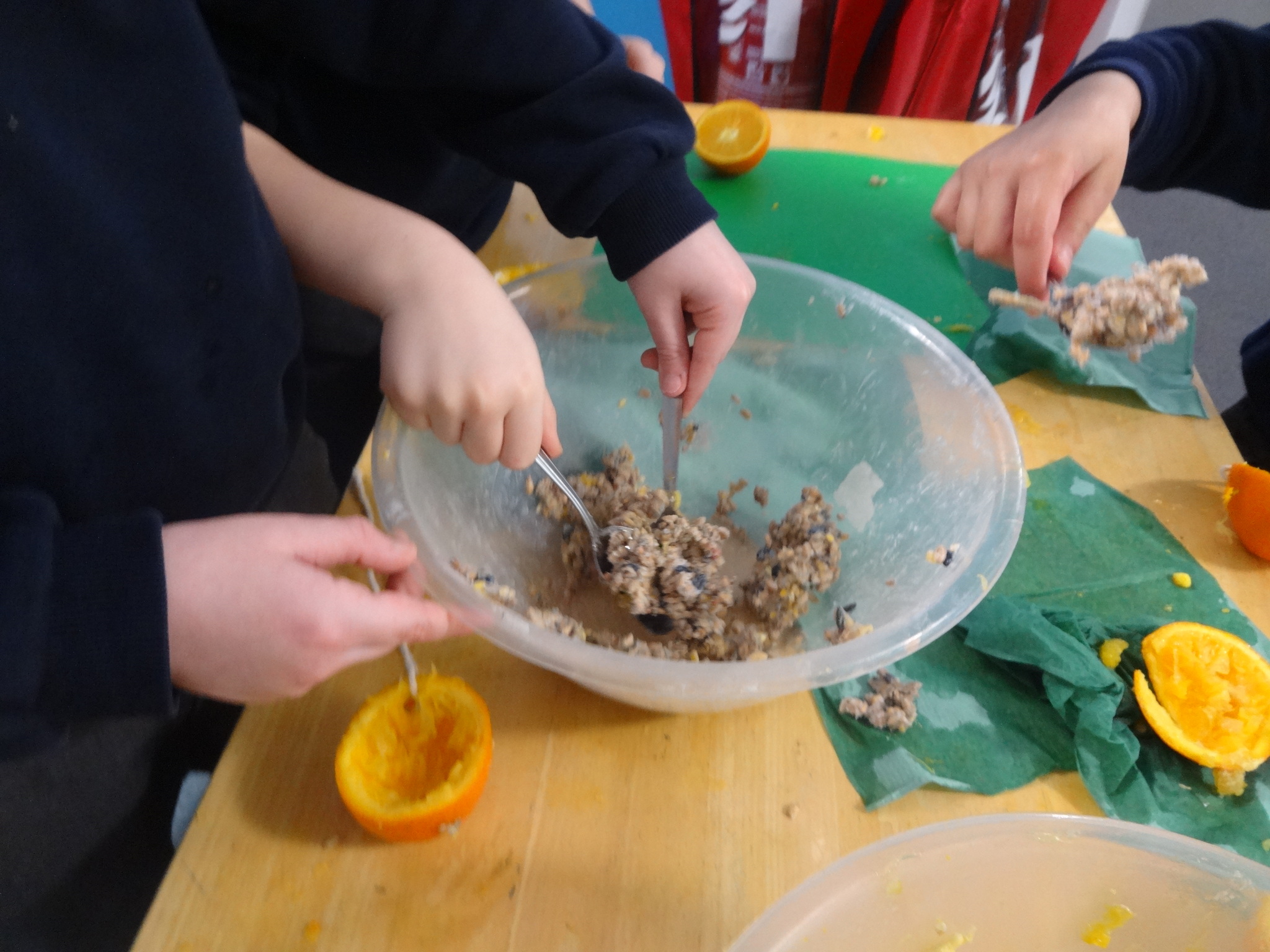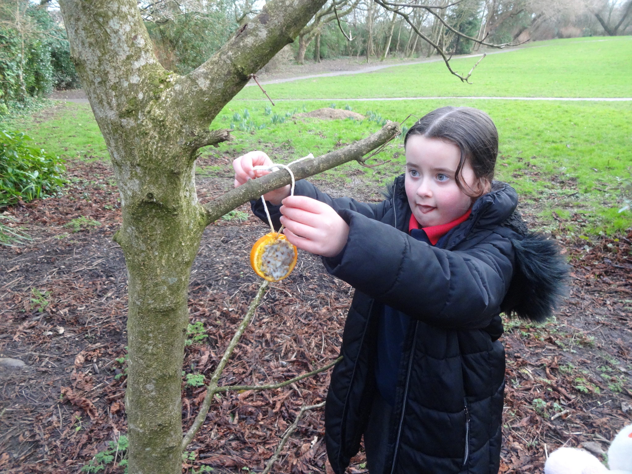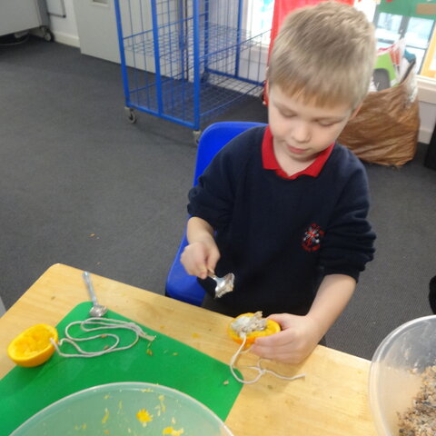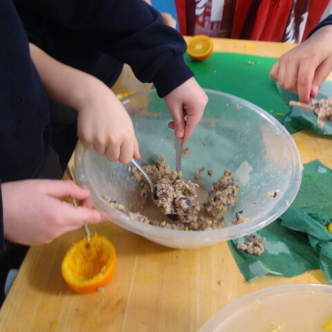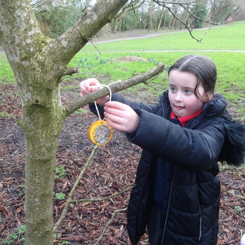 Class 2 had fun making bird feeders from oranges, lard and seeds. We took our bird feeders with us on our nature trip to the Rock Gardens. We thought about why birds might need extra food in winter and then hung our feeders in the trees. We hope the birds enjoy eating them!